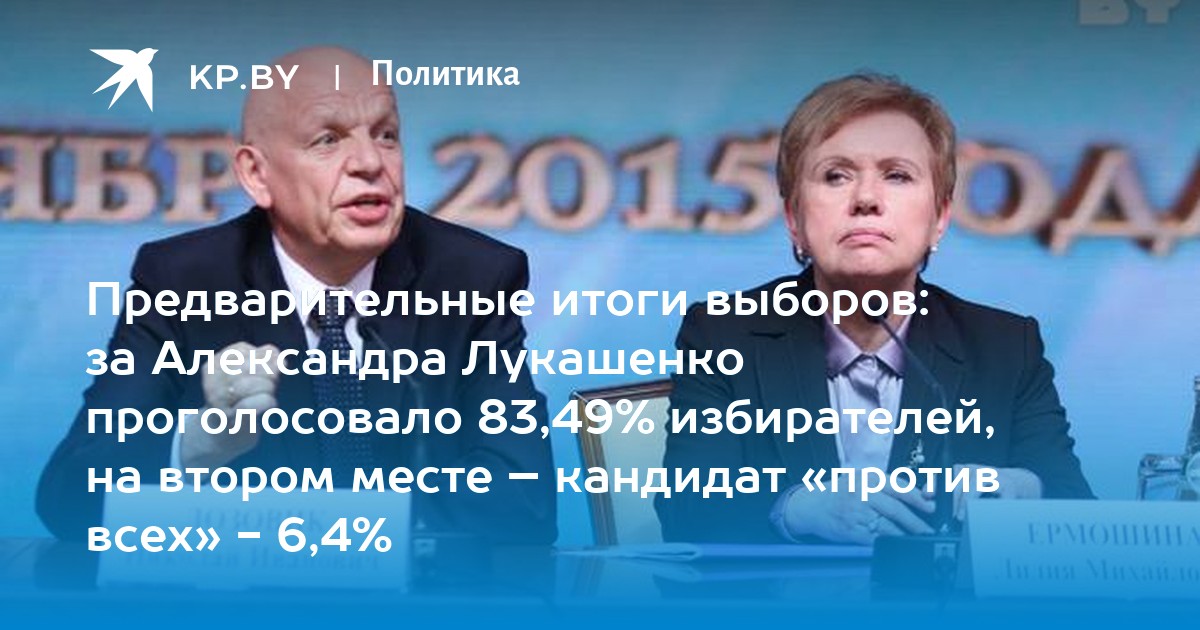 В половине третьего ночи председатель Центрального избирательного комитета Лидия Ермошина озвучила предварительные данные по итогам выборов президента. На данный момент за действующего главу государства Александра Лукашенко проголосовали 83,49% избирателей. На втором месте – кандидат «против всех» 6,4%, на третьем – Татьяна Короткевич 4,42%, на четвертом – Серей Гайдукевич 3,32%. За Николая Улаховича проголосовало 1,67% белорусов.
